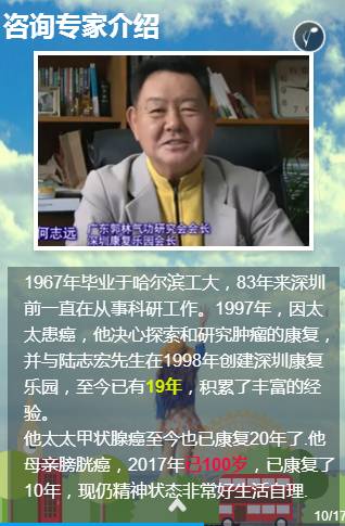 (请看到此消息的朋友,,告知身边有需要参加的朋友,谢谢) 1.《医患所关心六大问题》 2.《肿瘤康复的十四大康复体系》 3.《防范肿瘤君转移复发中医中药的独特功效》 4.《心理咨询》 个性化康复指导 5. 《营养干预》 由从事肿瘤康复20年的肿瘤康复专家讲课