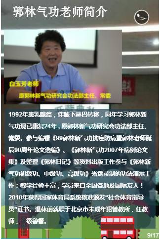 (二)郭林新气功培训 1、预备功收功; 2、中度风呼吸法自然行功; 3、强度风呼吸法特快功 4、中度风呼吸法中快功 5、风呼吸法定步功 6、中度风呼吸法点步功 7、升降开合松静功 . 8.手棍功 9、涌泉穴按摩功 10、头部按摩功 11. 吐音功 12. 脚棍功 (三)培训课程活动方式