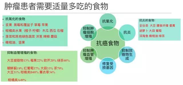 肿瘤患者适宜的食物(1)每天蔬菜300-500克,水果200-400克。一半是深色的蔬果,颜色种类多样化。 (2) 主食应以五谷杂粮或薯类为主,最好1/2是全谷类或杂豆类,如全麦面、 糙米、燕麦米/片、小米、玉米、荞麦、薏米、藜麦、红豆、花豆、绿豆。 (3)每日及每餐经常食用一些蛋、奶、鱼类、禽畜肉类或大豆制品等优质蛋白质。每周至少吃2-3次鱼,其中一次应为含n-3脂肪酸高的深海鱼如三文鱼或鲭鱼。 (4)选用低脂奶制品,包括牛奶或酸奶。 (5)烹调油可选择如橄榄油、茶籽油、亚麻油、芥花油等优质植物油。