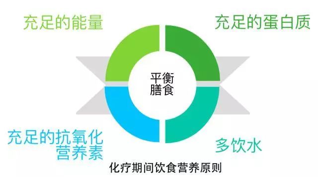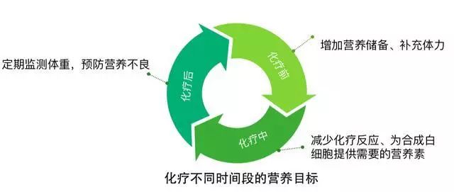 化疗前: (1)均衡饮食:每日饮食中包含谷薯类(米饭、面食)、蔬菜水果类、鱼禽畜肉蛋类、奶及豆制品类以及油脂类五大类食物。 (2)每日3-5餐:加餐可以选择酸奶、馒头片、饼干、水果、肠内营养配方粉、蛋白粉等。 (3) 选低脂、高蛋白、高维生素等食物: 如:米饭、面食、鸡蛋、鱼肉、鸡肉、瘦肉、豆腐、新鲜蔬菜水果等。