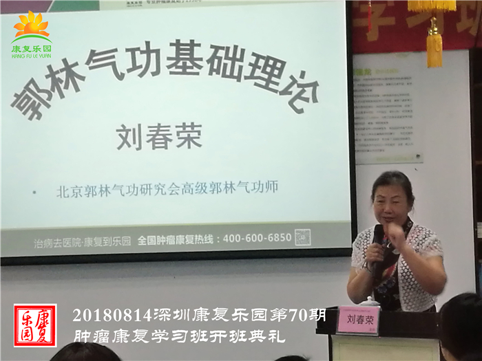 本期康复学习班教功老师刘春荣老师,刘老师北京郭林新气功研究会高级气功指导师。国家一级社会体育指导师。她白血病成功了康复27年,郭林新气功教学24年。刘老师给大家讲了郭林气功的基础知识! 郭林气功亦称新 气功疗法,属吐纳派功法,是郭林根据家传气功并结合自身练功实践的探索和研究所创。主要用于癌症患者。郭林气功正是在这一转变中诞生并努力实践的典范。郭林老师在七十年代初,就提出的西医、中医、气功三结合治癌防癌的新理念,经近40年的大量实践证明,它确实是癌症患者自我康复卓有成效的手段。