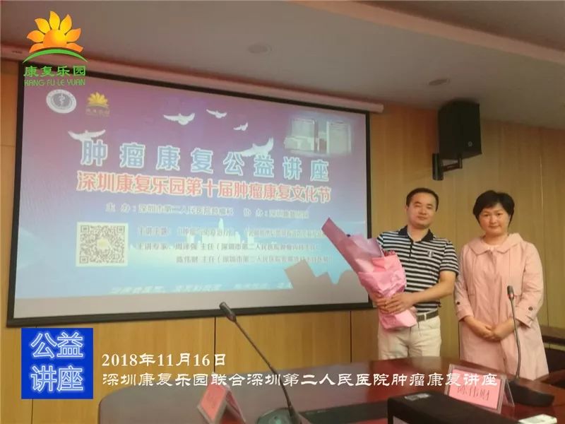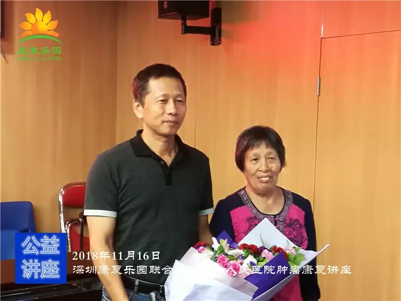 他说人体就像一个国家(一个社会),而肿瘤细胞,就是社会上的“坏分子”,人体的免疫系统就是国家的军队与警察,肿瘤细胞出来干坏事就惹乱了整个人体的免疫系统,而患癌就是身体的免疫系统遭到破坏。而免疫治疗就是想办法提高患者自身的免疫力,修复人体的免疫系统。 讲座完成后,深圳康复乐园的曾在二院治疗过的会员为二位主任献上了鲜花,并他们的付出与帮助表示衷心的感谢。