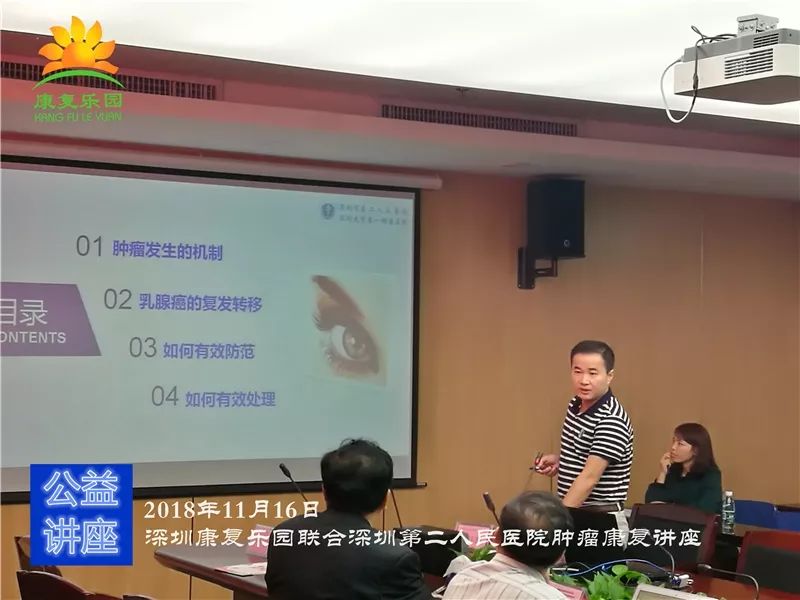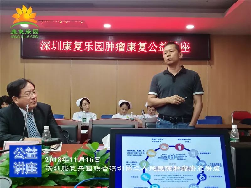 康复乐园陆志宏理事长发表了讲话,他说康复乐园走到今天,非常感谢像周主任这样热心专家对我们的支持,同时也感谢新老员朋友对康复乐园的信任与支持。其实癌症并不可怕,可怕是人得癌症后的恐惧与孤独,所以康复乐园提倡“群体抗癌,走成功康复之路”。康复乐园一直在专注于肿瘤康复,已经帮助很多的肿瘤患者成功走向了康复。他还说癌症患者的康复不是单一而多方面,所以患者一定要进行综合干预。