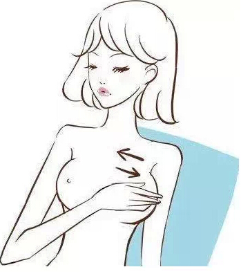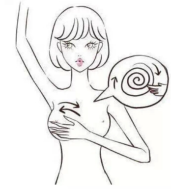 2、左手上举至头部后侧,用右手检查左乳,以指腹轻压乳房,感觉是否有硬块,由乳头开始做环状顺时针方向检查,逐渐向外(约三四圈),至全部乳房检查完为止。用同样方法检查右边乳房。