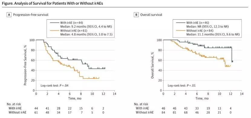 是药三分毒!患者在受益于免疫治疗的同时,也承担着它的不良反应。殊不知,免疫相关不良反应却预示着更好的有效率、更长的生存期! 1、约40%的肿瘤患者会出现不同程度的免疫相关不良反应 自2013年被《科学》杂志评为年度最重要的科学突破以来,肿瘤免疫治疗一直备受关注。免疫治疗作为治疗癌症的一把利器,有利也有弊。它对抗肿瘤的效果我们有目共睹,但也不能忽视其不良反应,也就是患者最担心的副作用。 免疫检查点抑制剂的作用机制在于阻断PD-L1与PD-1的结合,重新激活T细胞,以恢复T细胞的肿瘤杀伤作用。但T细胞一旦被激活,不仅会攻击体内的癌细胞,还会损伤正常的组织细胞。由于免疫系统的失衡,免疫检查点抑制剂的使用会带来很多不良反应,称之为免疫相关不良反应(immune-related adverse events,irAEs)。临床约40%的肿瘤患者使用PD-1免疫检查点抑制剂后会不同程度地出现皮疹、间质性肺炎、肠炎、肝炎、甲状腺炎等各种免疫相关不良反应。 2、发生免疫相关不良反应的患者无疾病进展生存期延长近一倍 2017年在《JAMA Oncology》上发表的一项研究发现:用PD-1免疫检查点抑制剂后,出现免疫相关不良反应患者的无进展生存期(PFS)和总生存期(OS)都明显好于未出现不良反应的患者。 该研究回顾分析了134名来自多家医学中心的晚期非小细胞肺癌患者,他们均接受纳武利尤单抗(Nivolumab)治疗,以治疗开始后每6周观察和记录一次不良反应,研究患者的不良反应和无疾病进展生存期、总生存期之间的相关性。 该研究发现出现不良反应患者的总体有效率明显高于未出现者,分别为52.3%和27.9%。这说明免疫治疗患者出现免疫相关不良反应提示有更好的治疗效果。那么,这种治疗效果体现在哪些方面呢? 进一步分析发现,出现不良反应组患者的中位无疾病进展生存期为9.2个月,明显高于未出现不良反应组(4.8个月);在总生存期方面,出现不良反应组未达到中位总生存期(超过12个月),而未出现不良反应组的中位总生存期为11.1个月。 也就是说,无论从无疾病进展生存期还是总生存期方面,出现免疫相关不良反应的患者明显好于没有出现不良反应的患者。 这对癌症患者而言简直是一种“福音”,出现不良反应并不可怕,反而应该感到高兴! 3、免疫相关不良反应的种类与生存期相关 上述研究中,进一步对不良反应进行亚组分析,发现皮肤毒性、内分泌毒性与更长的无疾病进展生存期密切相关;同时,皮肤毒性也与更长的总生存期密切相关,而内分泌毒性无此相关性。 此外,也有研究表明在接受PD-1免疫检查点抑制剂治疗的非小细胞肺癌中出现甲状腺炎可能提示更长的总生存期。 简单地说,早期出现不良反应提示对PD-1免疫检查点抑制剂有着更好的疗效反应,其中出现皮肤毒性、内分泌毒性则预示着更准确的疗效。 4、过度激活T细胞引起免疫相关不良反应 这些免疫治疗相关不良反应的出现,预示着更好的疗效反应。然而目前并不清楚其机制,可能与免疫检查点在维持自身免疫平衡的过程中起着重要作用有关。 从PD-1免疫检查点抑制剂的作用机制来说,其在激活T细胞杀伤癌细胞的同时,免疫系统被过度激活,激活的T细胞也可以杀伤某些正常组织细胞,进而引起免疫相关不良反应。也就是说,出现不良反应时,表明免疫系统已经被有效激活,这也从侧面印证了出现不良反应时治疗效果更好的结论。 我们都知道,白癜风是PD-1免疫检查点抑制剂治疗黑色素瘤过程中最常见的不良反应。有研究表明,黑色素瘤细胞与正常黑色素细胞之间可能存在共同抗原,由共同抗原刺激机体产生的共同抗体,可与相关组织发生交叉免疫反应。 然而,在非小细胞肺癌患者中是否存在这种共同抗原机制尚未得知。 5、免疫相关不良反应的识别及处理 在免疫治疗过程中,我们不要过分担心免疫治疗的不良反应,伴随而来的很可能是更好的疗效、更长的生存期。 大约有2/3的患者会出现免疫治疗相关不良反应,常见的免疫相关不良反应包括:皮肤毒性(斑丘疹和瘙痒)、疲乏、免疫性肝炎、免疫性肺炎、免疫性肠炎、免疫性肾炎、甲状腺功能减退。皮肤毒性通常最先出现。 早期识别并正确处理免疫相关不良反应对实现免疫抗肿瘤效应最大化具有重要作用。然而,免疫治疗所产生毒副反应的个体差异较大,因此了解并掌握不良反应的处理原则对抗肿瘤效果至关重要。 免疫治疗相关不良反应分为四级,分别采用不同的治疗方式: 一般来说,对于1级不良反应,仅需对症处理,在密切监视下继续使用免疫治疗。 对于2级不良反应,局部应用糖皮质激素或全身应用糖皮质激素(0.5-1mg/kg/d),可以继续使用免疫治疗; 对于3级不良反应,应暂停免疫治疗,并静脉使用糖皮质激素(强的松1-2mg/kg/d),连续使用三天后,症状缓解,激素剂量减半。如果症状无缓解,可考虑联合使用免疫抑制剂治疗如英夫利昔单抗、麦考酚酸酯以及免疫球蛋白等。当不良反应恢复至1级或1级以下时,可以重新谨慎使用免疫治疗,特别是那些早发型不良反应的患者更应谨慎。重新使用时不建议调整免疫治疗剂量。 对于4级不良反应,应积极静脉使用强的松1-2mg/kg/d联合使用免疫抑制剂治疗如英夫利昔单抗、麦考酚酸酯以及静脉用免疫球蛋白等,若症状缓解,逐渐减量至1mg/kg/d维持,后逐步减量,6周左右减量至停药。除一些已经通过激素替代得到控制的内分泌毒性以外,需要永