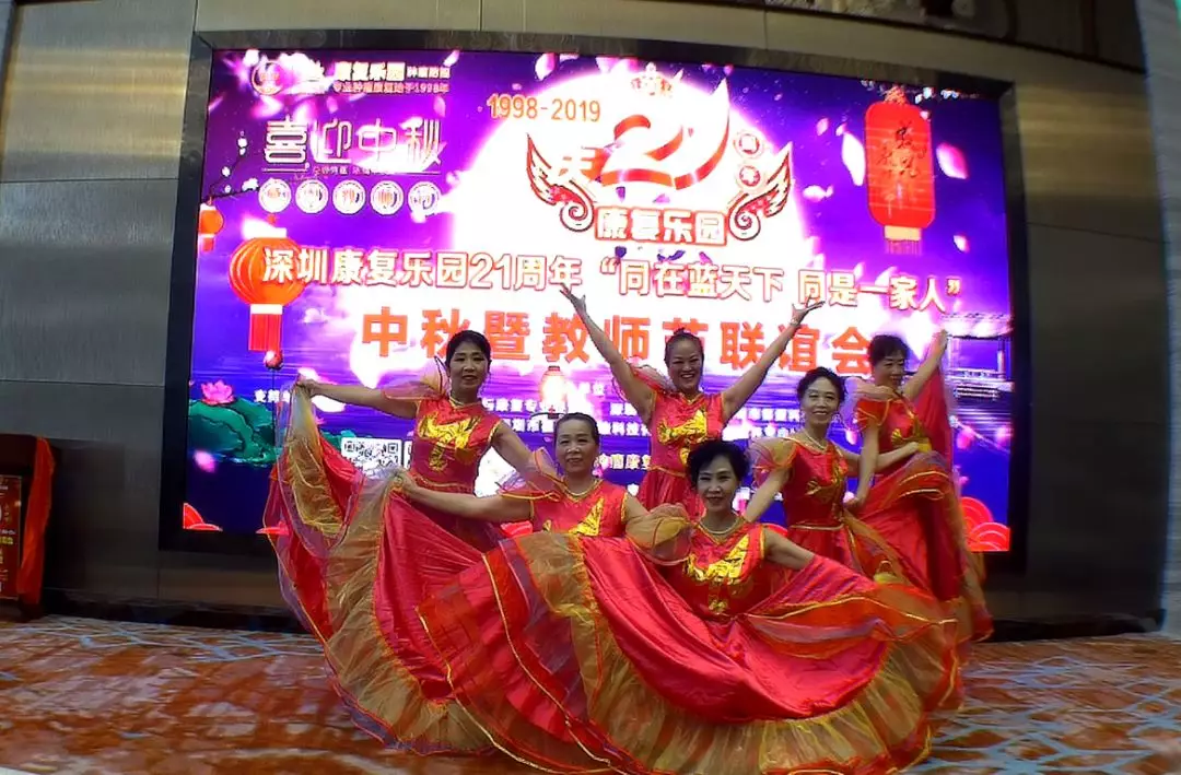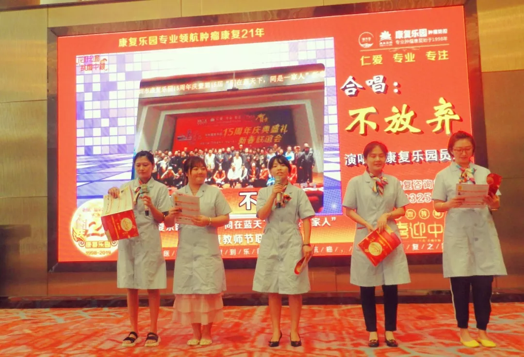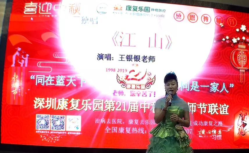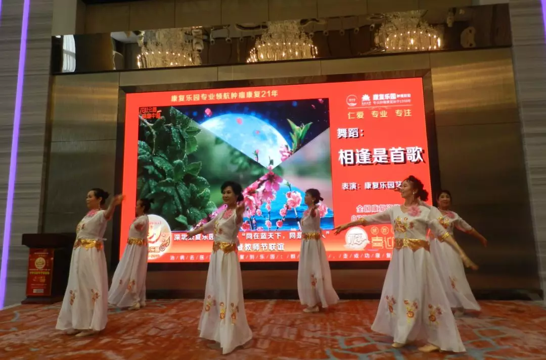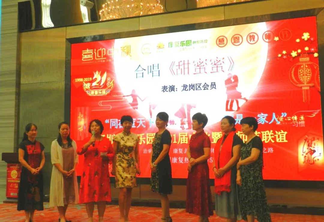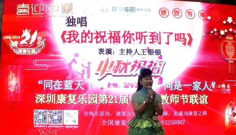 ● 看到这些快乐的抗癌明星,让现场的新加入康复乐园的会员朋友充满了康复的信心与勇气。就这样大家欢聚一起度过这美好快乐的好时光。活动现场福养堂健康科技还为大家带来丰富的奖品,为会员朋友抗癌呐喊!加油! ● 在这中秋与教师节双节同庆联谊活动上,当然少不了精彩的节目,深圳康复乐园的舞蹈队、合唱团、龙岗区的美女们给我们带来的精彩节目,享受了家一样的快乐和团圆。下面我们一起来欣赏一下她们的美姿!一饱眼福吧! 开场舞《阳光路上》 ▼ ▲表演:深圳康复乐园艺术团 合唱《歌唱祖国》 ▼ ▲表演:深圳康复乐园合唱团 舞蹈《相逢是首歌》 ▼ ▲表演:深圳康复乐园艺术团 合唱:《甜蜜蜜》 ▼ ▲表演:深圳康复乐园龙岗区的明星战友们 诗歌朗诵:《康复路上,我们一起出发》 ▼ ▲表演:深圳康复乐园艺术团 ▲表演:深圳康复乐园工作人员 主持人独唱 主持人独唱 教师节快乐-深圳康复乐园教师表彰 ● 无论生活的路有多远,学子的身后,总有老师注视的双眼。生活在知识的丰富中多彩,岁月在老师辛勤的汗水中盛满。在此教师节到来之际,康复乐园为教师会员送上了节日的祝福与礼物,并说声老师,您辛苦了! ● 中秋佳节,是团圆之日,是快乐之日,为此福养健康科技为会员们送来了丰富的奖品,活动现场获奖者们开心的笑容,对于成功抗癌的快乐之情!现场所有人员都表示衷心的祝贺!加油! 福养堂献礼,快乐开心抽奖与颁奖 治病去医院,康复到乐园 ,群体抗癌,走成功康复之路 让爱心传递成功一种习惯!康复路上,康复乐园与您一路同行! 也感谢康复乐园所有的会员朋友,因为有您们的支持和信任,让我们更有责任把最好的康复方法带给大家,也许这条康复路上有困难险阻,但是康复乐园一定和大家披荆斩棘,帮助会员身体康复! ● 最后在一首明天会更的歌声中,联谊活动圆满结束! 并合影留恋!
