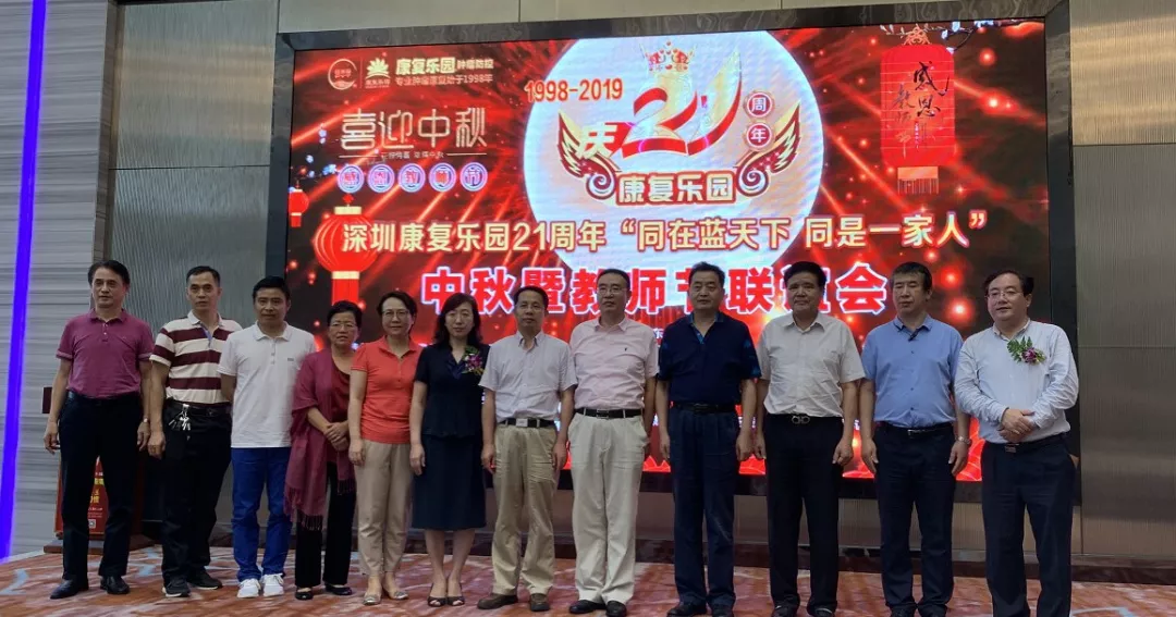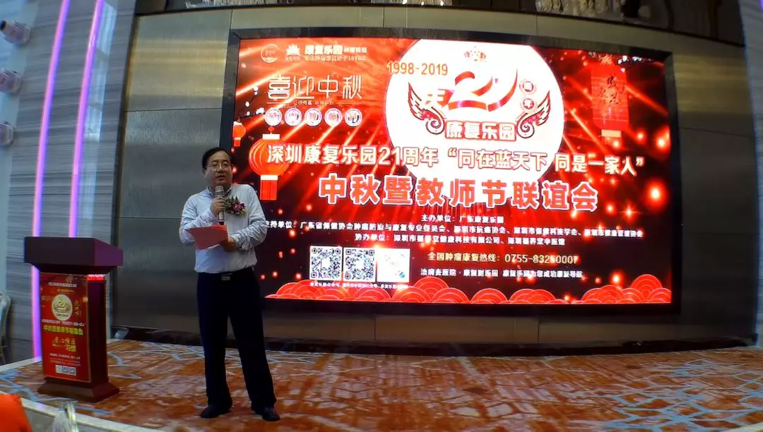 海上升明月,天涯共此时,又是一个花好月圆夜。 9月7日上午,在中秋与教师节到来之际,2019年深圳康复乐园21届“同在蓝天下,同是一家人”中秋暨教师节联谊会在深圳港湾宴会厅举行,参加本次活动的专家及会员朋友共有150多人。 ▼▼▼ ▲▲▲ ● 联谊活动大家欢歌笑语,节目内容也丰富多彩,有猜灯谜,抗癌明星舞蹈,独唱,合唱,抗癌明星分享,会员教师颁奖等! 首先康复乐园理事长陆志宏先生为联谊活动进行了致辞! “感恩 同心 坚持 共赢” ▼▼▼ ▲▲▲▲ 陆志宏理事长致辞