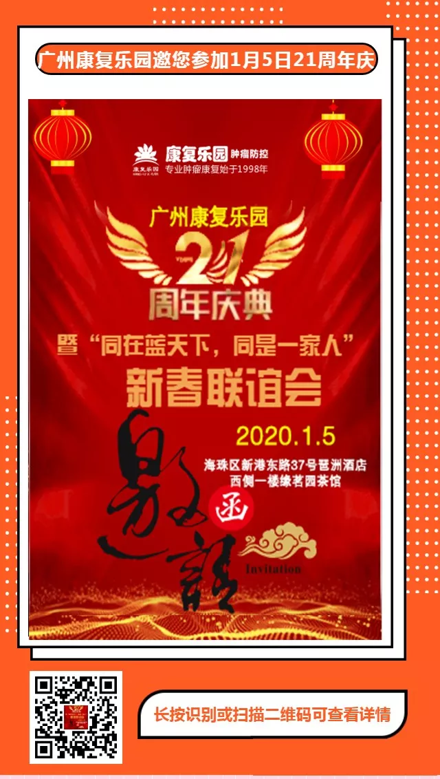 邀请函 时光荏苒,岁月峥嵘。2019年12月,康复乐园将走过21年的难忘历程,在此,陆志宏理事长携手全体员工感谢您长期以来对康复乐园工作的关心与支持!21年的科学抗癌路,21年的爱心曖人间,21年的坚守我们不忘初心,砥砺前行。诚挚地邀请您参加广东康复乐园21周年庆暨“同在蓝天下,同是一家人”新春联谊会。 一 深圳康复乐园周年庆 活动详情活动时间 2020年1月4日(周六)上午 9:00-12:30 活动地址 金碧轩海鲜大酒楼三楼金钻厅(福田区深南中路1045号红岭大厦) 活动精彩内容1. 精彩的文艺表演(有舞蹈 ,合唱,郭林气功表演等). 2. 2019年度深圳康复乐园抗癌好家庭,抗癌勇士,抗癌明星颁奖! 3. 国内知名专家教授咨询现场义诊(康复乐园为邀广东省中西医肿瘤专家,营养专家,心理专家义诊). 4.活动现场新老会员,抗癌明星,抗癌勇士面对面进行抗癌经验交流. 5.现场幸运大抽奖。(本次活动有精美礼品,活动大奖等你来拿.) 6.答谢午宴. 有您参加!活动才会更加精彩!期待您的到来! 一年又一年,深圳康复乐园21周年庆暨21届“同在蓝天下 同是一家人”新春联谊会将如期而至。在2019年,感谢各位专家对康复乐园的支持,感谢各位新老会员对康复乐园的信任,在这辞旧迎新的时刻。 诚挚邀请大家参与新春联谊会,让我们的爱在此绽放,让抗癌明星、抗癌好家庭、抗癌勇士登上颁奖舞台汲取更多的抗癌力量 让生命更精彩 预约报名电话 0755-83250007 交通指引 地铁:9号线红岭南路A出口 公交:红岭南路站 让爱心传递成为一种习惯。请转给有需要的朋友!期待您的到来! 二 广州康复乐园周年庆 活动详情活动时间 2020年1月5日(周日)下午 14:00-17:30 活动地址 广州海珠区新港东路37号琶洲酒店西侧一楼缘茗园 活动精彩内容1. 精彩的文艺表演(有舞蹈 ,合唱,郭林气功表演等). 2. 2019年度广州康复乐园抗癌好家庭,抗癌勇士,抗癌明星颁奖! 3. 国内知名专家教授咨询现场义诊(康复乐园为邀广东省中西医肿瘤专家,营养专家,心理专家义诊). 4.活动现场新老会员,抗癌明星,抗癌勇士面对面进行抗癌经验交流. 5.现场幸运大抽奖。(本次活动有精美礼品,活动大奖等你来拿.) 有您参加!活动才会更加精彩!期待您的到来! 一年又一年,广州康复乐园21周年庆暨21届“同在蓝天下 同是一家人”新春联谊会将如期而至。在2019年,感谢各位专家对康复乐园的支持,感谢各位新老会员对康复乐园的信任,在这辞旧迎新的时刻,诚挚邀请大家参与新春联谊会,让我们的爱在此绽放。 让抗癌明星、抗癌好家庭、抗癌勇士登上颁奖舞台,汲取更多的抗癌力量,让生命更精彩! 预约报名电话:020-87610451 交通指引 地铁8号线磨碟沙站B出口西行100余米即到) 让爱心传递成为一种习惯。 请转给有需要的朋友! 期待您的到来! |