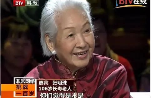 2011年,张明珠参加北京卫视的一档节目,震惊全场观众!因为106岁(2011年)的她,不仅全程自己走上台,而且皮肤细腻,神采奕奕,一点儿也看不出是位百岁老人。那么她到底有什么特殊的长寿秘诀呢?