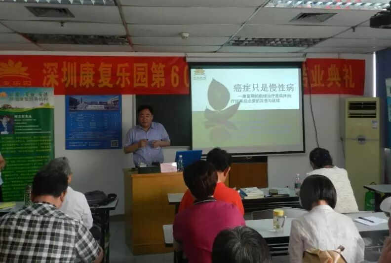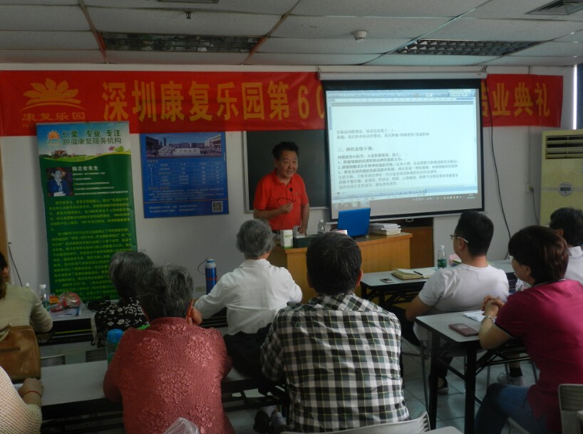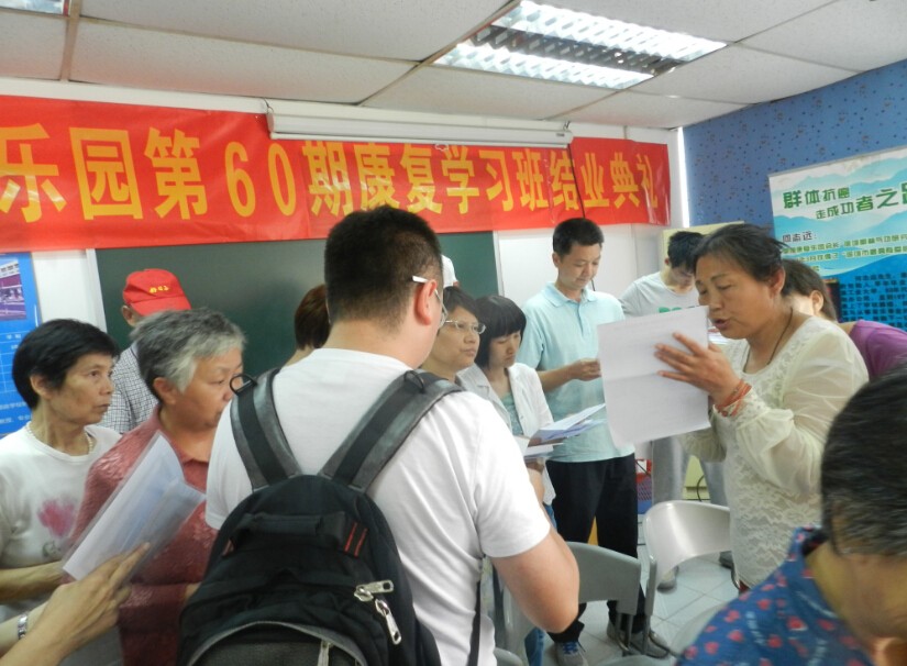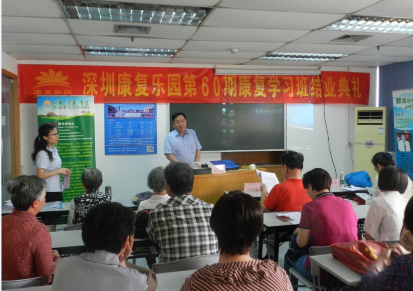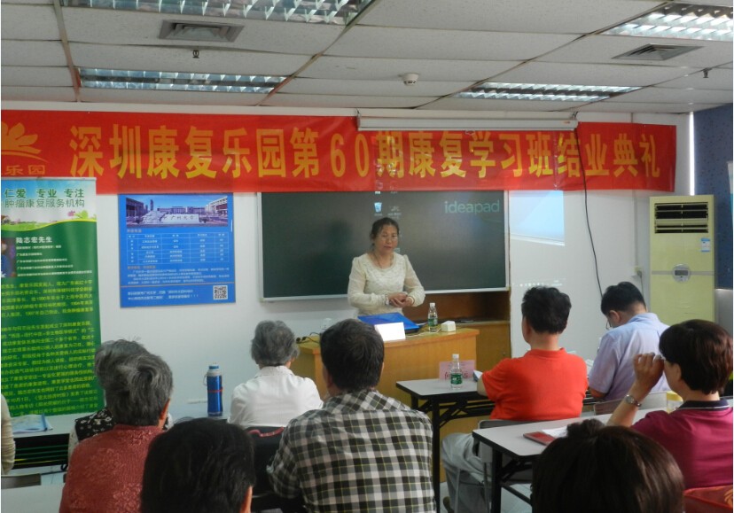 2015年4月30日,深圳康复乐园第60期康复学习班顺利结业。学习班开班期间,学员们不仅得到体能锻炼还学到很多关于肿瘤康复的知识,生活质量明显得到提高。出席这次典礼的有广东省保健协会肿瘤防治与康复专业委员会副主任委员、深圳市保健科技学会肿瘤康复专业委员会副主任委员、深圳市抗癌协会理事、康复乐园理事长陆志宏先生、北京郭林气功研究会顾问,广东郭林气功研究会会长,深圳康复乐园会长,肿瘤康复专家何志远先生和北京郭林气功研究会高级气功师刘春荣老师。