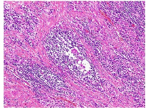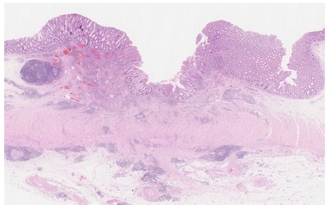 标本经福尔马林固定后每 3-5mm 组织切片。组织学检查显示明显的炎性淋巴细胞、浆细胞浸润和黏膜下层和固有肌层之间纤维化(图 6 和图 7)。解剖瘢痕处及淋巴结均没有发现癌细胞。
