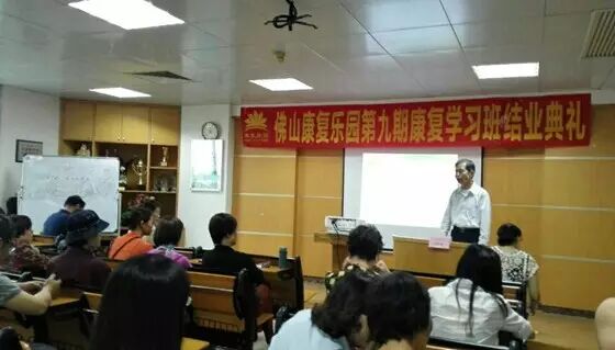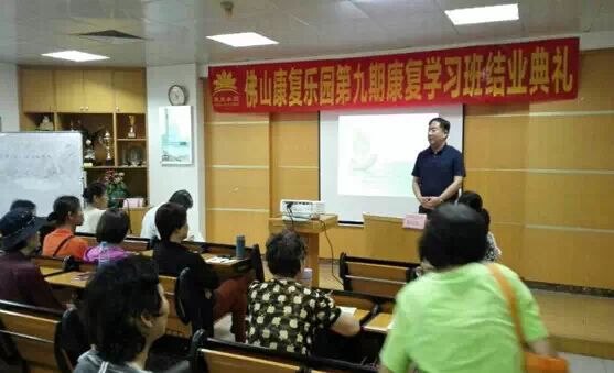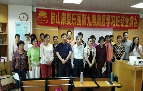 全体人员合影留念 佛山康复乐园第9期康复学习班于5月14日上午9:00在佛山市第一人民医院1号楼住院部11楼外科会议室举行了结业典礼,由广州康复乐园何金芳主任主持,出席典礼的有原广东省红十字会秘书长、广州康复乐园荣誉会长杨恩荣先生,康复乐园理事长、广东省保健协会肿瘤防治与康复专业委员会副主任委员、深圳市保健科技学会肿瘤康复专业委员会副主任委员、深圳市抗癌协会理事陆志宏先生和北京郭林气功研究会高级气功师刘春荣老师。