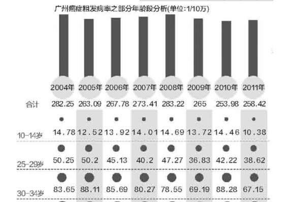 4月8日,脐带血移植前夕,梁礼潮隔窗看着女儿晴晴。 在肿瘤防治专家的眼中,除却儿童白血病目前暂无证据显示和人口老龄化相关外,其他的恶性肿瘤一般都与人体日渐衰老的年轮呈现正相关性。比如恶性肿瘤的总体发病率在0- 34岁阶段不会出现太过陡峭的波折,35—39岁年龄组开始快速上升,到了40-85岁年龄段,就如同加足马力的跑车般,风驰电掣地攀升…… 广州在2004- 2011年间,各年龄段的癌症发病率呈整体下降趋势。各年龄段癌症总体发病率在2008年达到最高值,其中1岁以内婴幼儿更是从2007年的6 6 .3 5 /10万飙升至2008年的108 .46/10万。据了解,由于奥运、金猪年等因素,当年的活产儿人口数达到历史最高峰,直接导致了1岁以内婴幼儿的癌症发病率达到最高点。 在2004-2009年间,每一年癌症发病率的年龄分布特点是:癌症在65岁以上人群高发,发病率都在十万分之一千左右。总体来看,随着年龄增大,发病率呈上升走势。 值得一提的是,在10岁前,不满一岁的幼儿是患发癌症的小高峰时段。14岁前,除0 - 1岁外,癌症发病率与年龄成反比。 A 2岁 不明原因的白血病 2015年4月8日。上午10时,上海道培医院的层流舱里,2岁的晴晴虚弱地躺在病床上,氧气罩、输液管、监测仪器等将她牢牢捆住。30分钟后,一份来自广州的脐血造血干细胞缓缓输入晴晴体内。父亲梁礼潮舒了一口气。 就在前不久,从不落泪的梁礼潮,还因为压力过大躲在医院卫生间嚎啕大哭。2岁的小女儿晴晴在去年9月被确诊为急性髓细胞白血病M 5型。这种类型的白血病癌细胞非常顽固,一般人进行一次化疗,可以把癌细胞打下去六七成,但晴晴每次化疗却只能打下去三四成。 女儿是怎么患上白血病的?梁礼潮感到纳闷,家乡上寮村是有名的长寿村,家族里也没人得过这类疾病“医生跟我说,1岁以内的小孩,得这个病很可能是遗传。1岁以上一般是后天因素,比如甲醛和空气污染。”听医生说完,梁礼潮打了个寒战,他想起女儿发病这半年来,上寮村因为拆迁,早就成了工地。“一车车装修废料、胶袋等往鱼塘里填,家门口经常臭气熏天。倒下去漫天灰尘,100米开外的东西都看不到。” 考虑到晴晴年纪太小不适于长期化疗,医院提出造血干细胞移植的治疗建议。合适的脐带血配型很快找到了,但移植后的医疗费用却毫无着落。无奈之下,梁礼潮只得通过微博向社会求助。 梁礼潮告诉记者,患病以来,晴晴经历了多个疗程的化疗,纤弱的胳膊上满是针眼和淤青。“她以前不会说普通话,可她人生中的第一句普通话竟然是对护士阿姨的哀求,‘我不要打针’。” 因为经济窘迫,梁礼潮甚至一度自责两年前没听亲戚的话存脐带血,“存了就有保险,也不至于倾家荡产”。尽管如此,他还是以12万元贱卖掉了市值30万元的花场。“我是一个种花的农民,为什么连自己生命中最珍贵的花朵都不能好好保护!我不想女儿这颗还未盛开的花苞就此凋谢,她还这么小、这么可爱,我怎么忍心看她枯萎?” ●点评:在0岁、1-4岁、5-9岁年龄组内,广州地区的儿童的白血病、神经母细胞瘤、肾母细胞瘤、恶性畸胎瘤等恶性肿瘤的发病率仍处于较高的水平。 白血病是诸多恶性肿瘤中,为数不多对人类进行无年龄差别攻击的疾病。好在目前的治疗技术日益提升,该疾病中的绝大多数仅通过药物化疗,就能取得较好效果。更严重的,也可以通过骨髓、外周血、脐带血干细胞移植予以拯救。 B 16岁 46岁 不幸父子接连患癌 清晨6时许,流花湖服装城门口,搬运工们摩拳擦掌,即将开始一天的忙碌。惟独有一位男子,不过40来岁,却因为病痛而面容憔悴。 去年4月,45岁的吴明(化名)被确诊为鼻咽癌。命运就像一场游戏,吴明怎么也没想到,仅时隔一年,16岁的儿子又查出患有直肠癌,而且已经到了中晚期。“爸爸,看到你和妈妈为了我这么辛苦,我死也要死得像样一点”,当病床上的儿子虚弱地吐出这句话时,吴明泪如泉涌。 “我不会让你死的!”吴明至今无法接受儿子患病的事实。“我知道我自己时间不会太久了,但是我儿子才16岁,花一样的年纪,他怎么能随我一起去呢!” 吴明回忆,儿子自小超重,12岁那年体重已经达到了120斤,因为在学校被老师和同学经常取笑,所以通过运动减肥。“患病前,他一米六几,110斤,看上去很健康。”直到今年3月,儿子出现便秘、大便带血、大便次数增加伴随腹泻等症状而来医院就诊,才发现患病。 “根据最新的流行病学调查,中国大肠癌(结、直肠癌)发病年龄平均比西方国家早10到15年”,广州军区广州总医院普外科副主任程黎阳说,“我就不明白,以前大肠癌在中国是低发病率的国家,现在怎么就呈现高发、低龄化趋势了呢?” 目前,吴明和儿子两人一个月的医疗费要一万多元,儿子还将面临12次的化疗。 ●点评:当恶性肿瘤开始表现为另类的“家庭聚集”般发病时,情况往往令人揪心。 直肠癌的发病率日益上升,和我们的饮食习惯密不可分。饮食过于精细化,高蛋白饮食的同时忽视了对蔬菜、水果等的摄入,导致肠道缺乏锻炼,大肠癌不断上升,且日益呈年轻化的趋势。结直肠癌广州地区的发病率男女合计20—24岁及以下组处于较低水平,25—29岁年龄段开始上升,80—84岁达最高。35岁以上各年龄组结直肠肝门癌粗发病率均为男性高于女性。 鼻咽癌这一广东曾经最为高发的癌症,近年来虽有下降,但依然保持着较高的发病率。历年的统计显示,广州市鼻咽癌