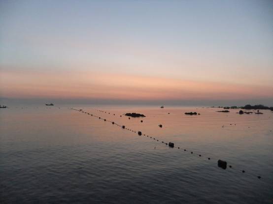 海边这时候已经聚集了很多看日出的游客了,尤其是桥上到达大海的末端,人们举着手机在拍摄着,天空像一部宽银幕电影,无比壮丽,海鸥时而掠过水面,时而低空飞行,时而高高弹起,发出啊啊的叫声,远处的海天交际处,渔火闪烁,这里的天空比之城里黑暗的天空,已经是蓝色的了,在海天之间像飘过一段粉红色的丝带,并渐渐地,丝带被分成两段,4点45分,渔船开始出海,我还担心影响看日出效果,没想到他们很快就划开了,并在远处成为一道风景。