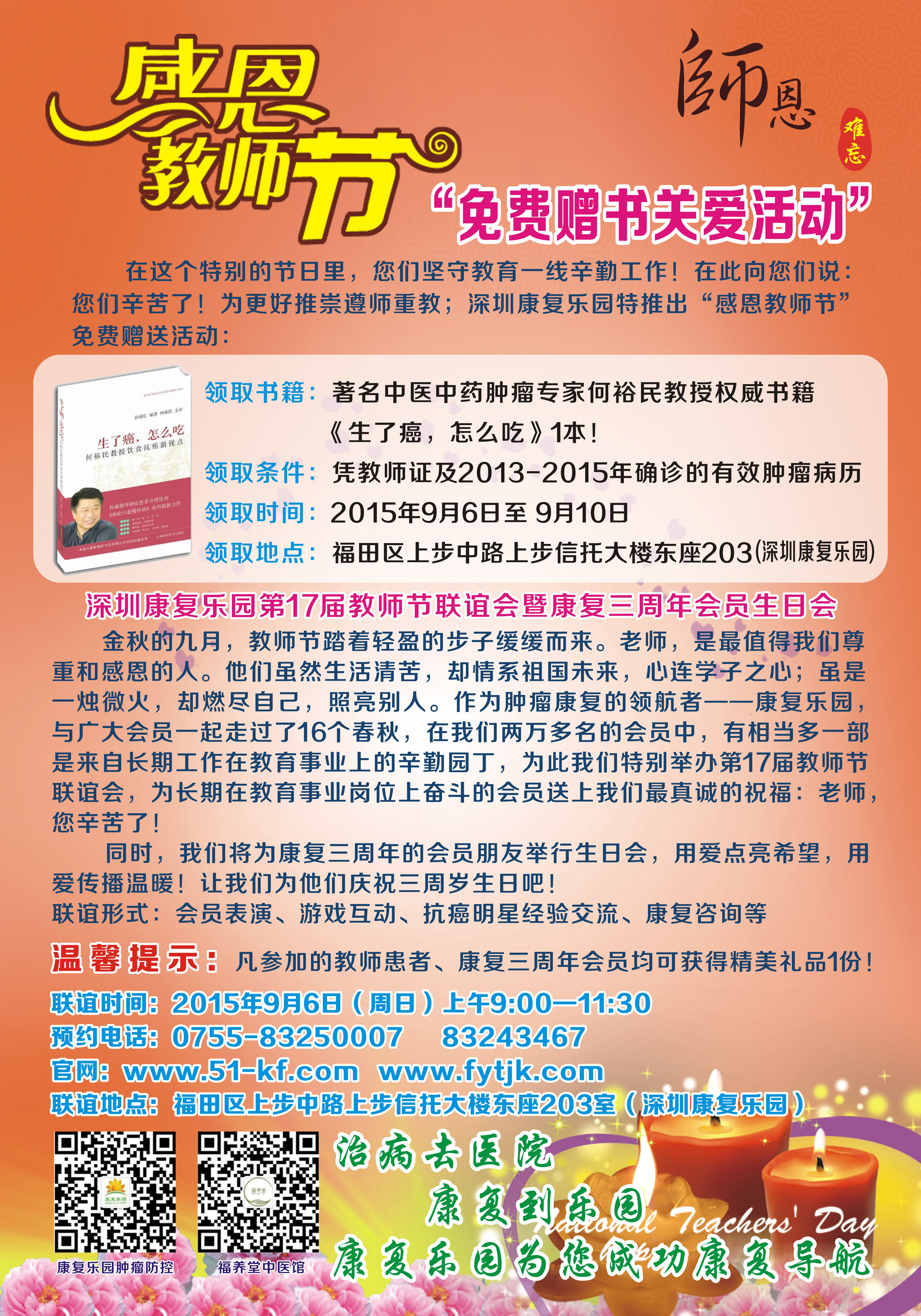 感恩教师节 ——“免费赠书关爱活动” 在这个特别的节日里,您们坚守教育一线辛勤工作!在此向您们说:您们辛苦了!为更好推崇遵师重教;深圳康复乐园特推出“感恩教师节”免费赠送活动: 领取书籍:著名中医中药肿瘤专家何裕民教授权威书籍《生了癌,怎么吃》1本! 领取条件:凭教师证及2013-2015年确诊的有效肿瘤病历 领取时间:2015年9月6日至 9月10日 领取地点:福田区上步中路上步信托大楼东座203(深圳康复乐园) ![]() 深圳康复乐园第17届教师节联谊会暨康复三周年会员生日会 金秋的九月,教师节踏着轻盈的步子缓缓而来。老师,是最值得我们尊重和感恩的人。他们虽然生活清苦,却情系祖国未来,心连学子之心;虽是一烛微火,却燃尽自己,照亮别人。作为肿瘤康复的领航者——康复乐园,与广大会员一起走过了16个春秋,在我们两万多名的会员中,有相当多一部分是来自长期工作在教育事业上的辛勤园丁,为此我们特别举办第17届教师节联谊会,为长期在教育事业岗位上奋斗的会员送上我们最真诚的祝福:老师,您辛苦了! 同时,我们将为康复三周年的会员朋友举行生日会,用爱点亮希望,用爱传播温暖!让我们为他们庆祝三周岁生日吧! 联谊形式:会员表演、游戏互动、抗癌明星经验交流、康复咨询等 温馨提示: 凡参加的教师患者、康复三周年会员均可获得精美礼品1份! 联谊时间:2015年9月6日(周日)上午9:00—11:30 联谊地点:福田区上步中路上步信托大楼东座203室(深圳康复乐园) 预约电话:0755-83250007 83243467 (责任编辑:康复乐园) |
