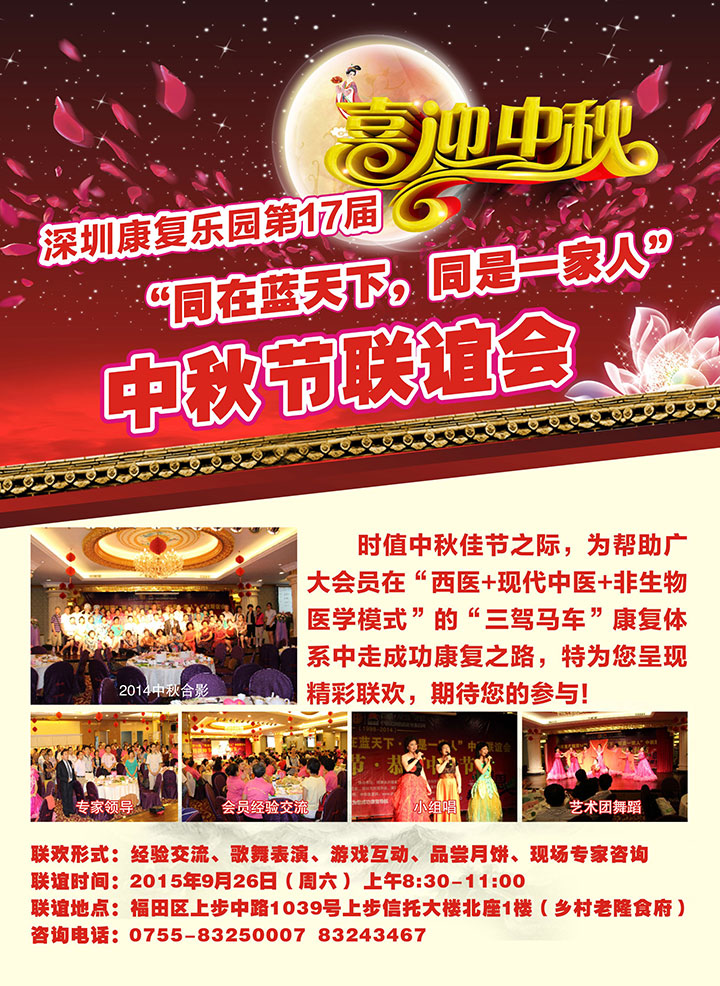 时值中秋佳节之际,康复乐园为帮助广大会员在“西医+现代中医+非生物医学模式”的“三驾马车”康复体系中走成功康复之路,特为您呈现精彩联欢,期待您的参与!