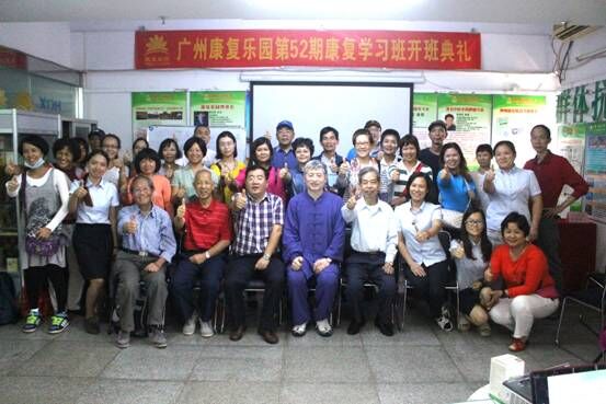 2015年10月19日上午广州康复乐园举办了第52期康复学习班开班典礼。为帮助广大肿瘤患者更快、更好地走向康复,广州康复乐园已举办了51期康复学习班,为广大肿瘤患者们提供了科学权威的体能锻炼和成功康复方法。广州康复乐园举办的第52期康复学习班,从肿瘤知识、体能锻炼、心理饮食等方面给予患者权威科学的康复指导。本次特邀高级郭林气功师、全国抗癌明星、肠癌成功康复29年赵继锋老师亲自教功查功;广东省保健协会肿瘤防治与康复专业委员会副主任委员,深圳市抗癌协会癌症康复与姑息治疗专业委员会副主任委员,康复乐园理事长陆志宏先生;广东省红十字会原秘书长,广州康复乐园荣誉会长杨恩荣先生;还有各病种抗癌明星成功康复经验交流。
